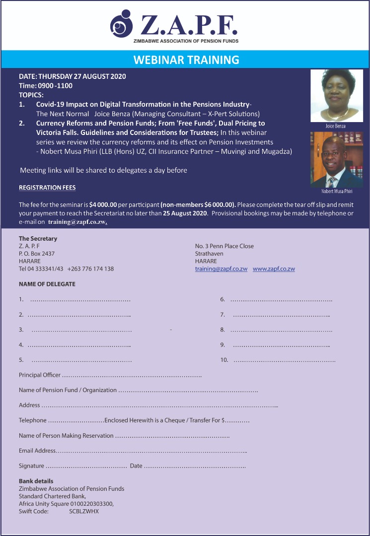 HARARE, THE Zimbabwe Association of Pension Funds (ZAPF) will be hosting a webinar training workshop focusing on the impact of COVIDS 19 and currency reforms on the pensions industry.